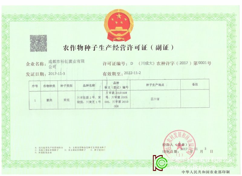 農(nóng)作物種子生產(chǎn)經(jīng)營(yíng)許可證(副證)
